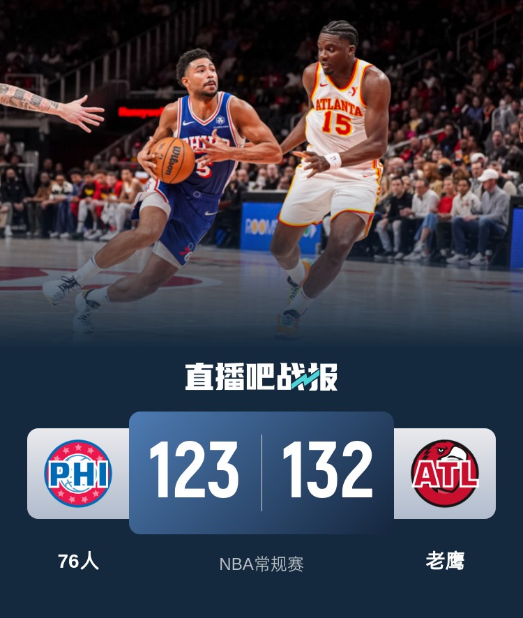 比赛上来,老鹰先拿五分取得领先,不过76人及时追了上来,两队此后陷入到长时间的拉锯中,场上比分交替领先,次节老鹰依旧攻势不减,而76人逐渐败下阵来,分差也是拉开到两位数,半场结束时76人落后9分;下半场回来,老鹰连续第三个单节得分破30分,分差也被继续扩大到二十分以上,末节76人虽然有追分的势头,但终究未能完成逆转,最终老鹰力克76人迎来三连胜。