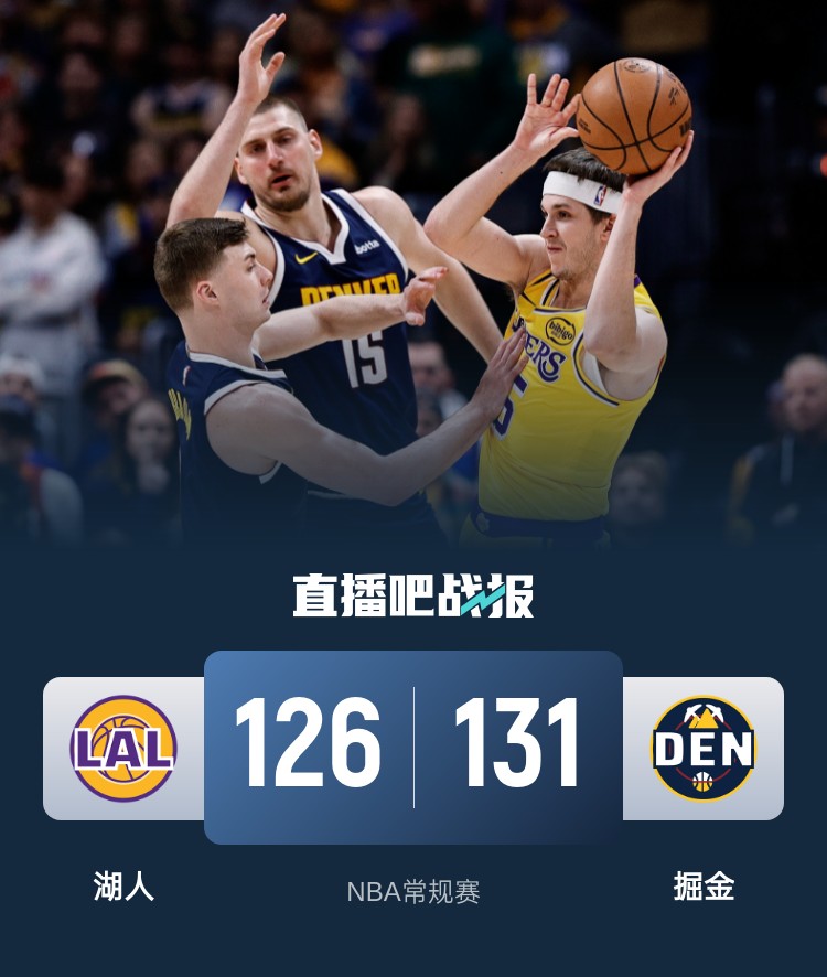 湖人虽然伤兵满营但里夫斯首节表现出色砍下12+5+7的全能数据;布朗尼也在轮换阶段披挂上阵,他在末段先是拼抢进攻篮板造犯规并两罚全中,随后又命中三分,湖人首节狂砍40分抢占主动权。次节掘金这头“猛狮”攻防两端全面苏醒,进攻端多点开花的情况下送上一波25-12的攻势迅速反超比分;湖人面对对手暴走顶住压力,里夫斯半场拿下22分的情况下帮助湖人追至4分进入下半场。休息归来掘金上来就是一波12-4的攻势直接拉开两位数分差;不过顽强的湖人在里夫斯的梳理下一直能够咬住比分,掘金的不愠不火也导致大优局面被扭转,湖人轰出跨节17-4的攻势上演大逆转;末段双方神仙对决几次互换领先悬念留到最后,不过穆雷最后时刻不讲理的干拔三分直接杀死比赛。最终,掘金主场力克湖人拿下比赛,同时送湖人4连败。