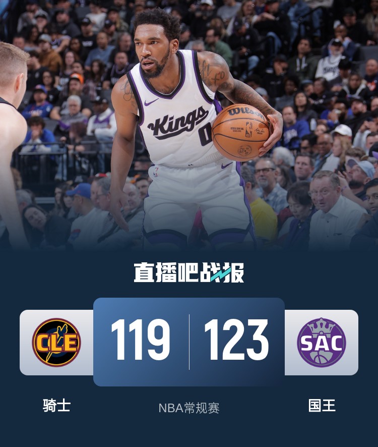 上半场,骑士率先发力,内外开花打出20-7的开局,国王回敬8-2的攻击波缩小分差,次节双方大打对攻,国王里突外投连续拿分,骑士轮番冲击篮筐连投带罚保持优势,半场战罢骑士56-47领先国王。下半场,国王奋力反击打出17-2完成反超并获得两位数优势,骑士及时回暖完成14-2的攻击波,末节双方争夺陷入白热化,德罗赞飙中三分再度将双方拉回同一起跑线,关键时刻国王持续发力确立5分优势,骑士无力回天。最终,国王123-119力克骑士,送给对手3连败。