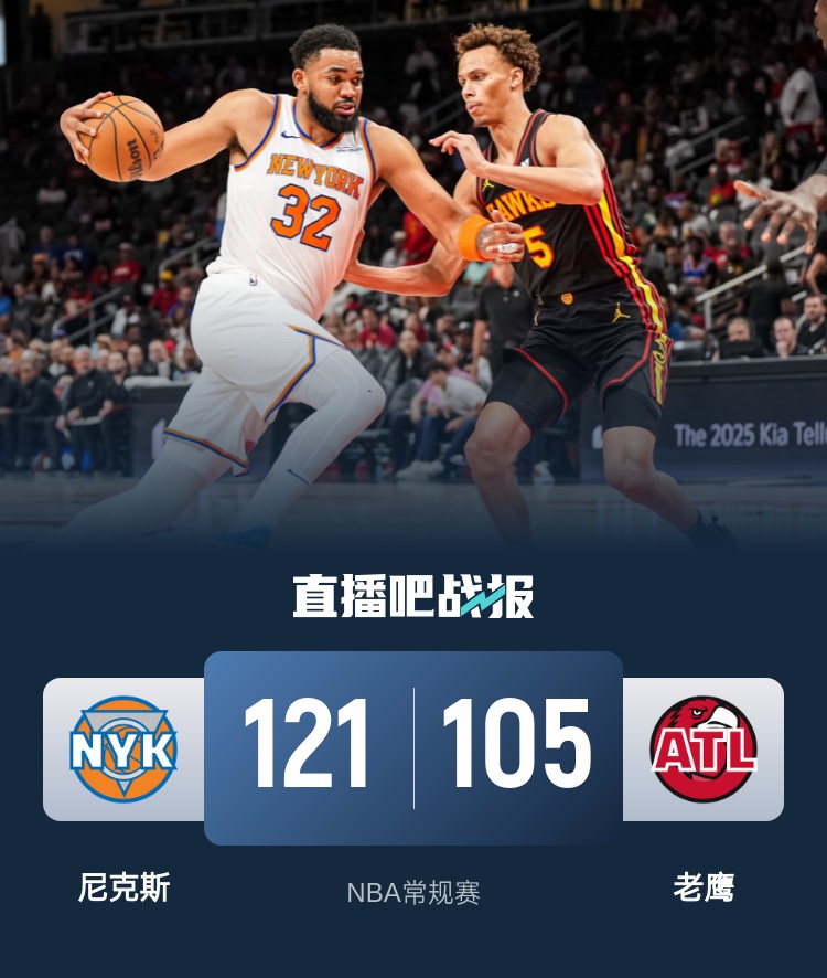 比赛开始,吹杨里突外投打开手感很早,尼克斯多点开花回应,随后老鹰连续失误,尼克斯打反击领先到双位数,特雷-杨突破止血,首节尼克斯领先7分,次节双方在场上连续打铁,老鹰突然断电,尼克斯轰出15-0超级攻击波,外线下起三分雨一度领先到30分以上。下半场,阿努诺比连续反击砍下7分,尼克斯13-2攻击波重新拉开30分以上领先,随后双方拉锯战,三节尼克斯依然领先28分,末节唐斯帮助尼克斯牢牢掌握住20分以上领先,半节过后双方相继换上替补练兵,最终尼克斯121-105轻取老鹰。