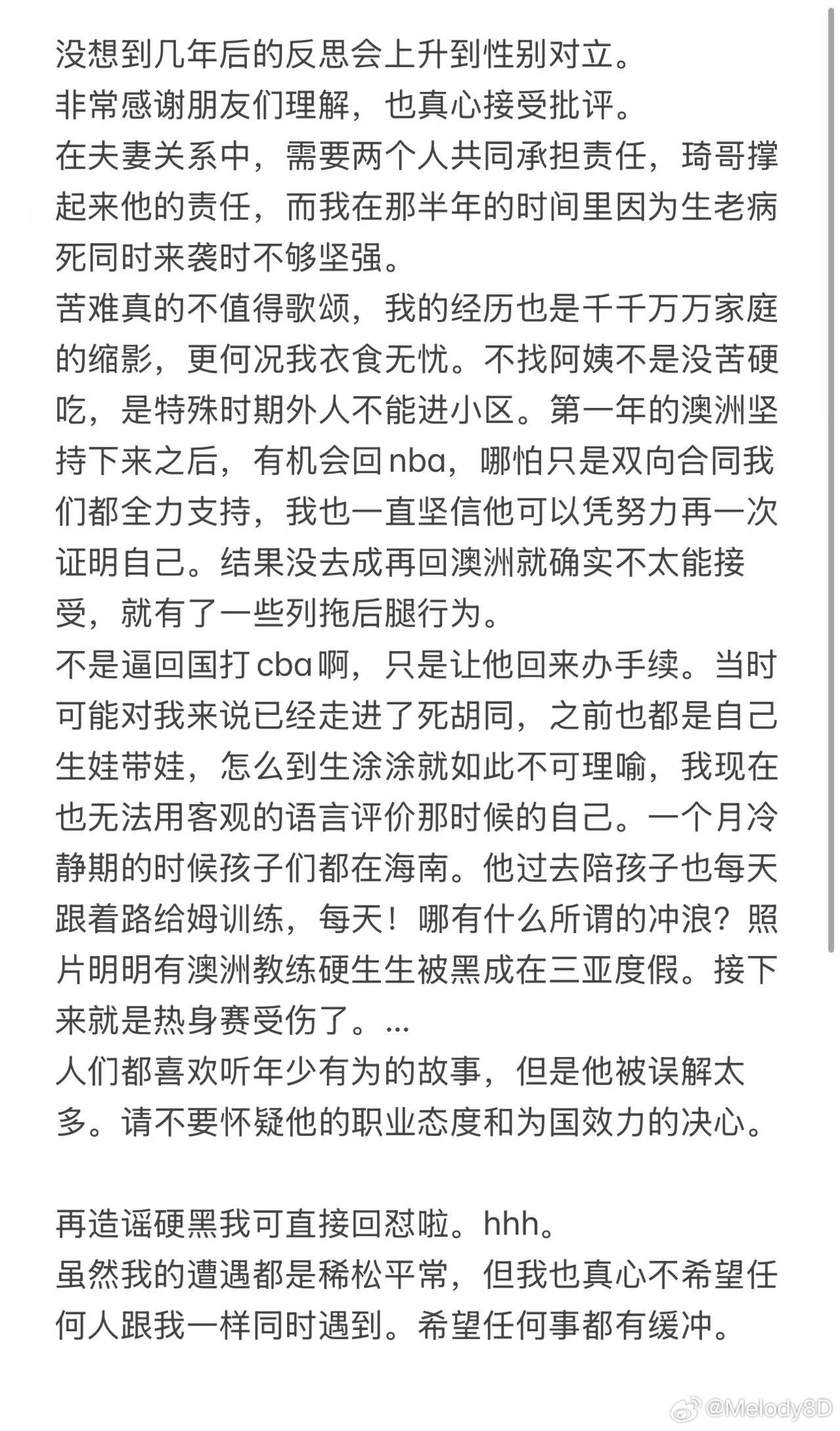 不是逼回国打cba啊,只是让他回来办手续。当时可能对我来说已经走进了死胡同,之前也都是自己生娃带娃,怎么到生涂涂就如此不可理喻,我现在也无法用客观的语言评价那时候的自己。一个月冷静期的时候孩子们都在海南。他过去陪孩子也每天跟着路给姆训练,每天!哪有什么所谓的冲浪?照片明明有澳洲教练硬生生被黑成在三亚度假。接下来就是热身赛受伤了。...