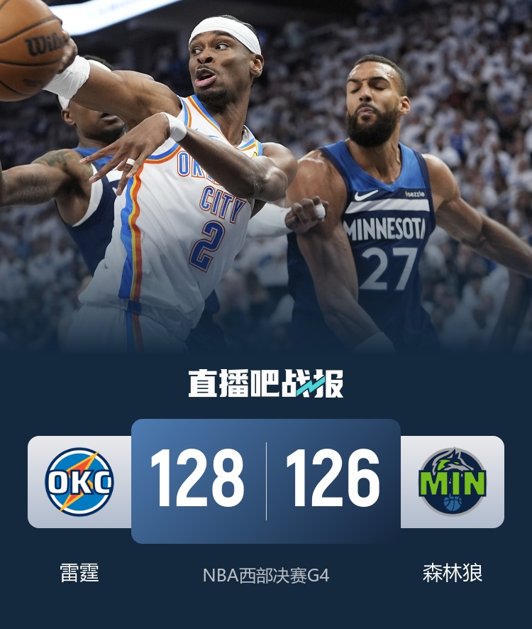 比赛开始,两队开场便陷入缠斗,比分交替领先,亚历山大得分助攻一肩挑,杰伦-威廉姆斯频频外线开炮,森林狼多点开花给出回应,双方对飙三分,次节两队继续对攻,雷霆内外开花占据场上主动,爱德华兹遭遇严防,沃克高效发挥帮助球队追赶,半场战罢雷霆65-57领先森林狼。易边再战,卡鲁索先中三分将分差拉开到两位数,迪文岑佐连中三分,森林狼回敬11-2的攻击波一举扳平比分,雷霆回敬7-0的攻击波稳住局势,末节双方继续缠斗,森林狼内外开花,但亚历山大和杰伦-威廉姆斯联手拿分强势回应,关键时刻麦克丹尼尔斯三分还有追到2分,亚历山大6罚5中率队保持优势,雷霆使用点球战术,杰伦威最后时刻空中拦截,最终,雷霆128-126力克森林狼,总比分3-1领先拿到赛点。