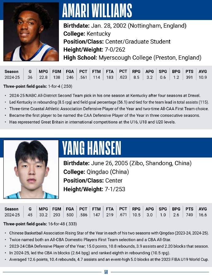 有28名球员享有每人单独一页资料,或许可以理解他们是更热门的首轮球员,杨瀚森被放在第二梯队之中,按姓氏顺序与肯塔基的阿马里-威廉姆斯分享了一页。所以杨瀚森能进首轮吗?我想大家都有着共同的期待,但因为2025年选秀的特殊性,这可能依旧是相对的小概率事件,包括几家权威媒体最新的选秀预测榜单上,杨瀚森的排名区间都在二轮初段,这或许是更符合理性认知下的期待区间。