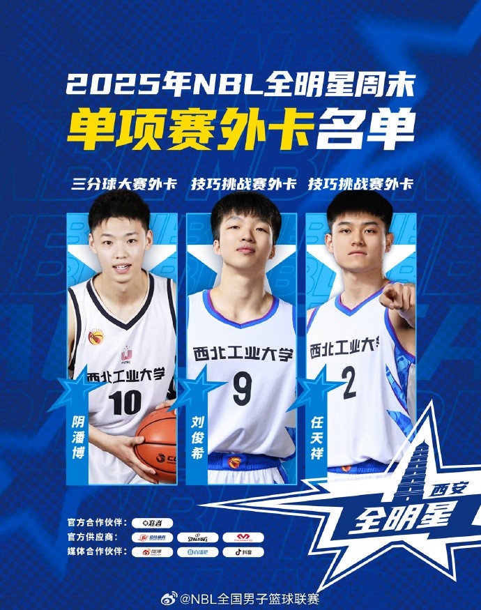 2025年NBL全明星单项赛将迎来三位来自西北工业大学的外卡球员。他们将分别参加技巧挑战赛和三分球大赛。