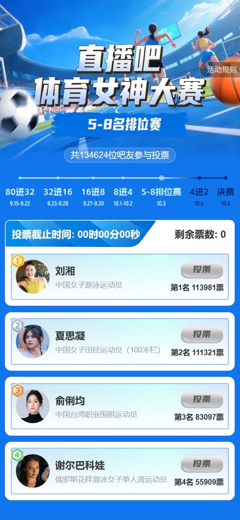 直播吧体育女神大赛5-8排名:刘湘险胜夏思凝获第5 俞俐均获第7