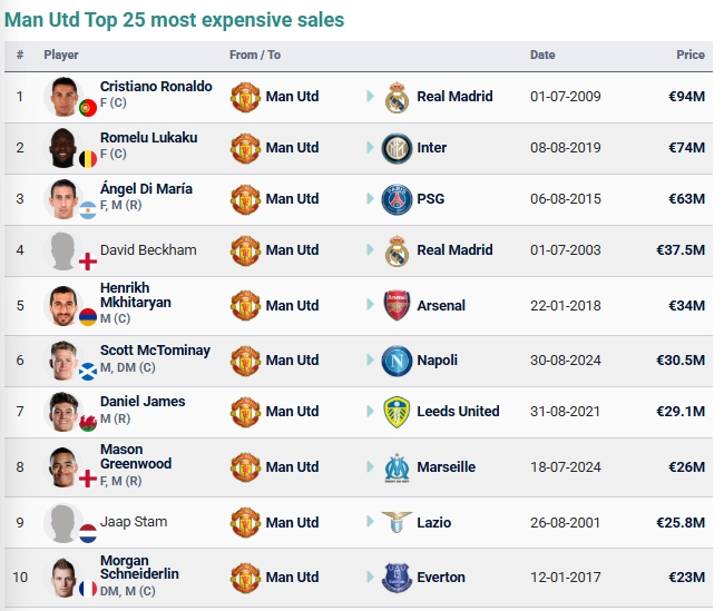 Robin Bairner晒出了曼联队史卖人收入榜,并配文:“我们能不能讨论一下曼联在出售球员方面的糟糕表现?贝克汉姆20多年前以3750万欧元的价格转会,至今仍排在曼联队史卖人榜第四位。”