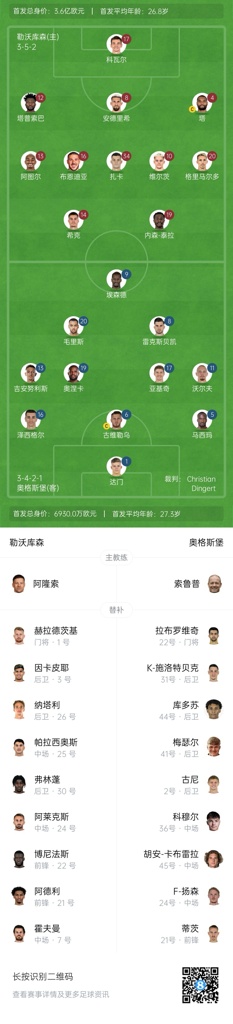 勒沃库森首发:17-科瓦尔、4-若纳坦-塔、12-塔普索巴、13-阿图尔、20-格里马尔多、8-安德里希、10-维尔茨、34-扎卡、14-希克、19-内森-泰拉、16-布恩迪亚