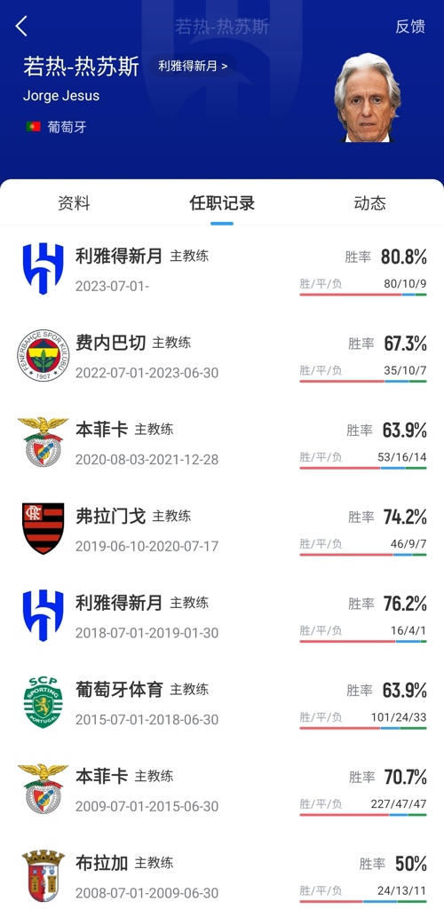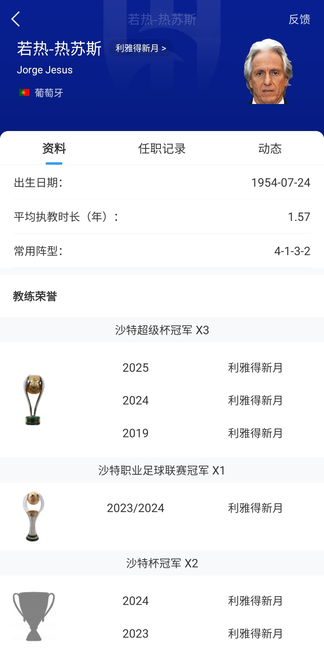 70岁的葡萄牙老帅若热-热苏斯,曾执教过本菲卡、葡萄牙体育、弗拉门戈和费内巴切等多支球队,2023年7月他第二次出任利雅得新月主帅,共计带队99场,取得80胜10平9负的战绩,帮助球队拿下1次沙特联冠军、2次沙特杯冠军和2次沙超杯冠军,但利雅得新月两度止步亚冠(亚冠精英联赛)半决赛,无缘冠军。