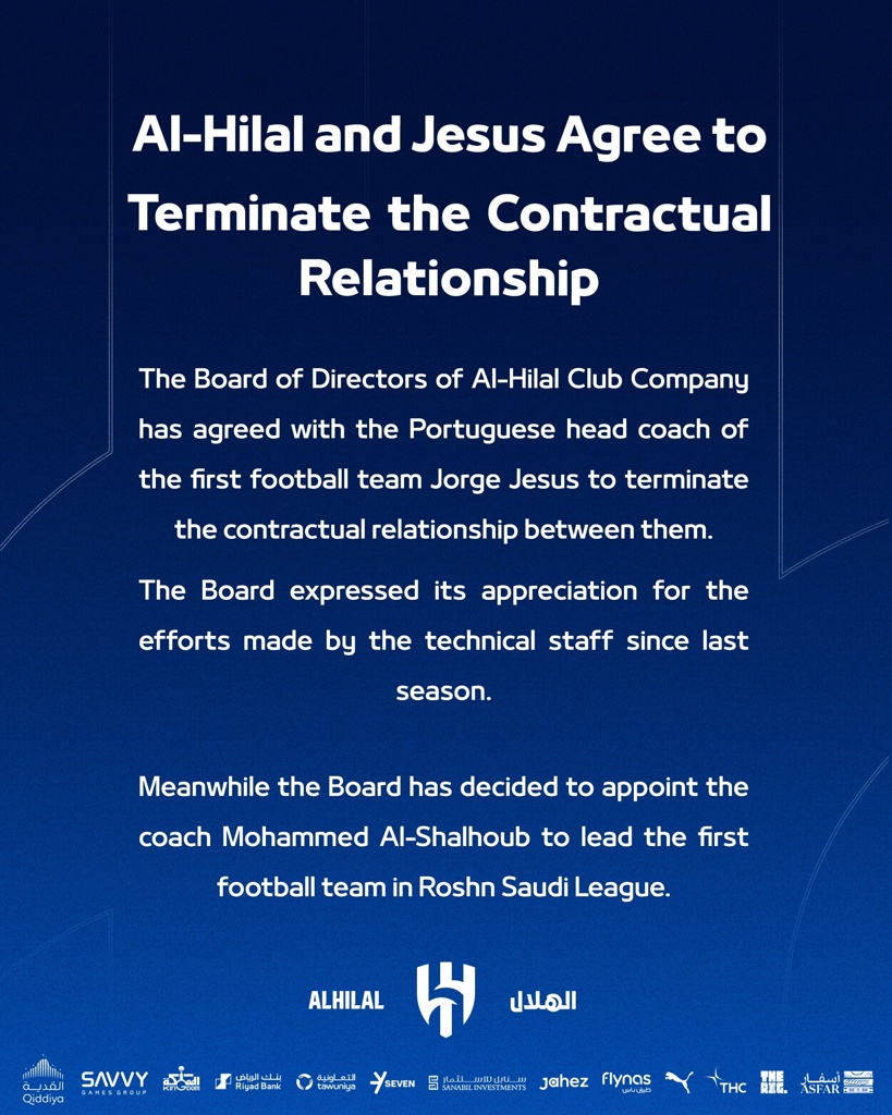 05月03日讯 利雅得新月官方消息,球队主帅若热-热苏斯下课,在此前结束的亚冠精英联赛半决赛中,利雅得新月1-3不敌吉达国民,无缘决赛。