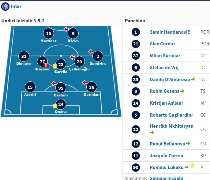 国米替补:1-汉达诺维奇(已退役)、21-科尔达兹(已退役)、5-加利亚尔迪尼(已离队)、6-德弗里、8-戈森斯(已离队)、11-华金-科雷亚、12-贝拉诺瓦(已离队)、14-阿斯拉尼、22-姆希塔良、33-丹布罗西奥(已离队)、37-什克里尼亚尔(已离队)、90-卢卡库(已离队)