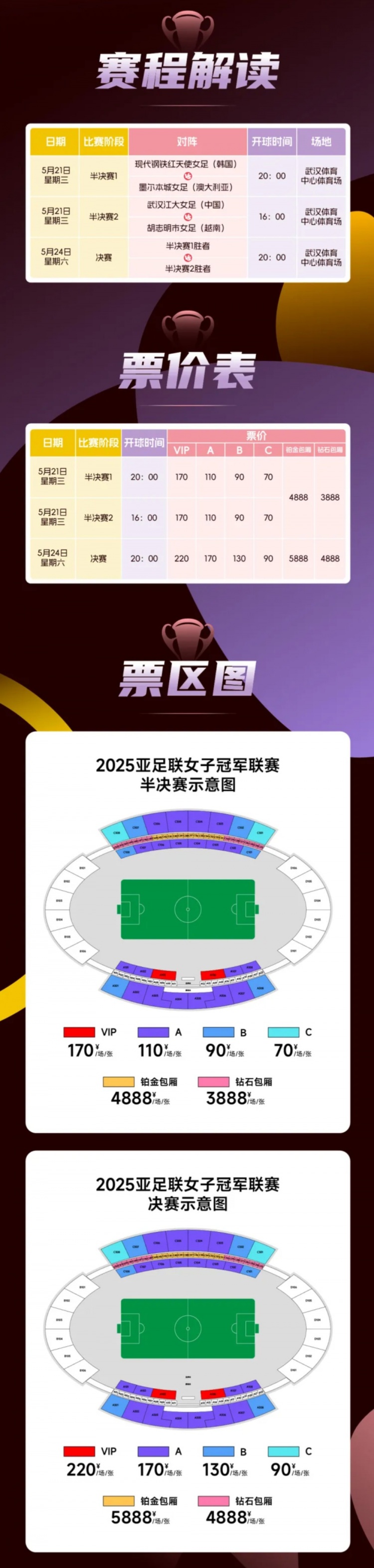 半决赛(5月21日)和决赛(5月24日)将在武汉体育中心上演,中国武汉江大女足也将在家乡父老的面前再次开启她们的传奇之旅,代表中国足球再次冲击亚洲之巅。