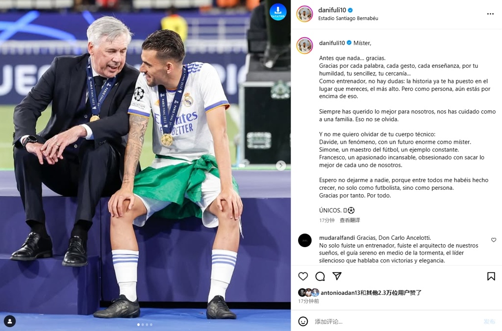 塞巴略斯更新社交媒体晒照发文告别安切洛蒂。