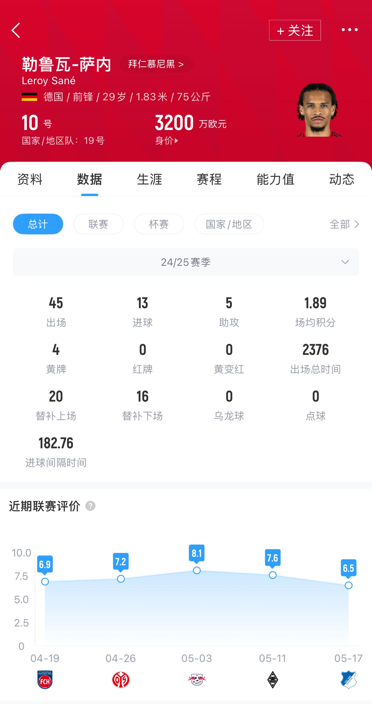 萨内本赛季为拜仁出战45场比赛,打进13球,助攻6次。球员现身价3200万欧。