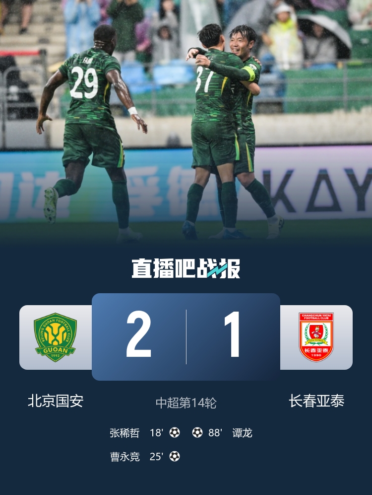 全场比赛结束,最终北京国安2-1长春亚泰。