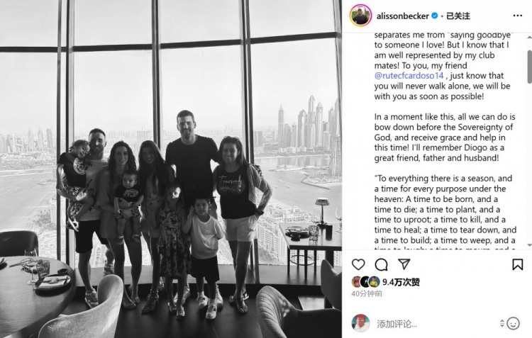阿利森悼念若塔:会记住迪奥戈是一位伟大的朋友、父亲和丈夫