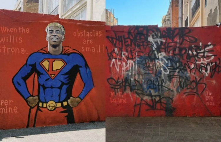 在原本的画作中,亚马尔被描绘成超人形象,胸前的S换成了L,并配有“当意志坚定时,障碍微不足道”的标语。不幸的是,位于埃斯科里亚尔街的作品现在几乎完全被黑色和白色颜料覆盖。