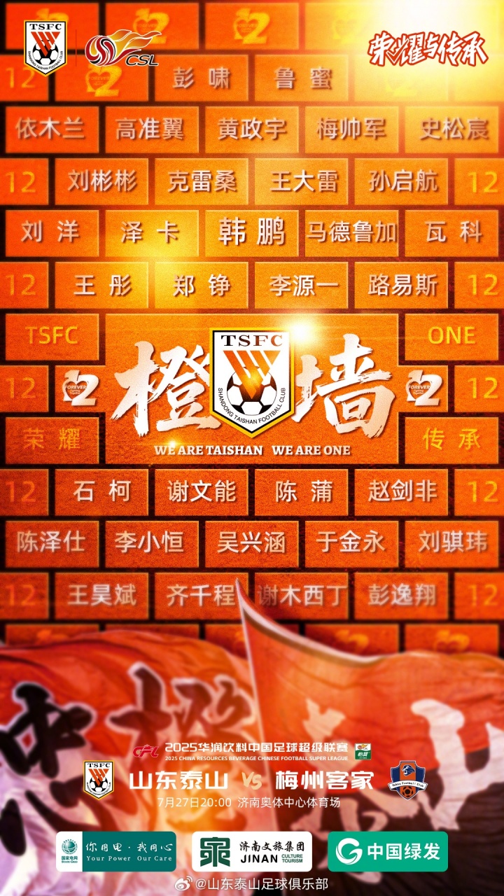 07月27日讯 北京时间今晚20点,中超第18轮,山东泰山主场迎战梅州客家,赛前双方公布首发阵容。