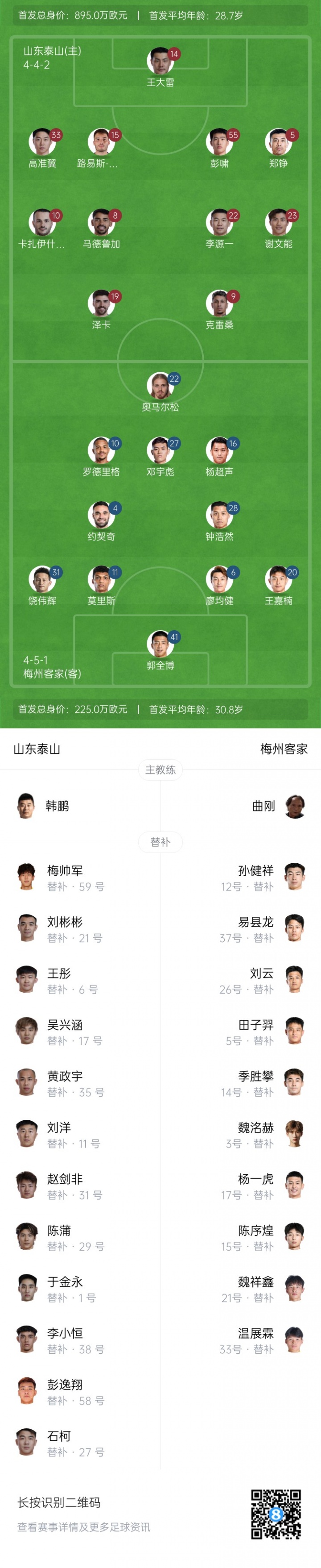 泰山vs梅州首发:5外援PK4外援,洛佩斯首秀 彭啸先发 杨超声出战
