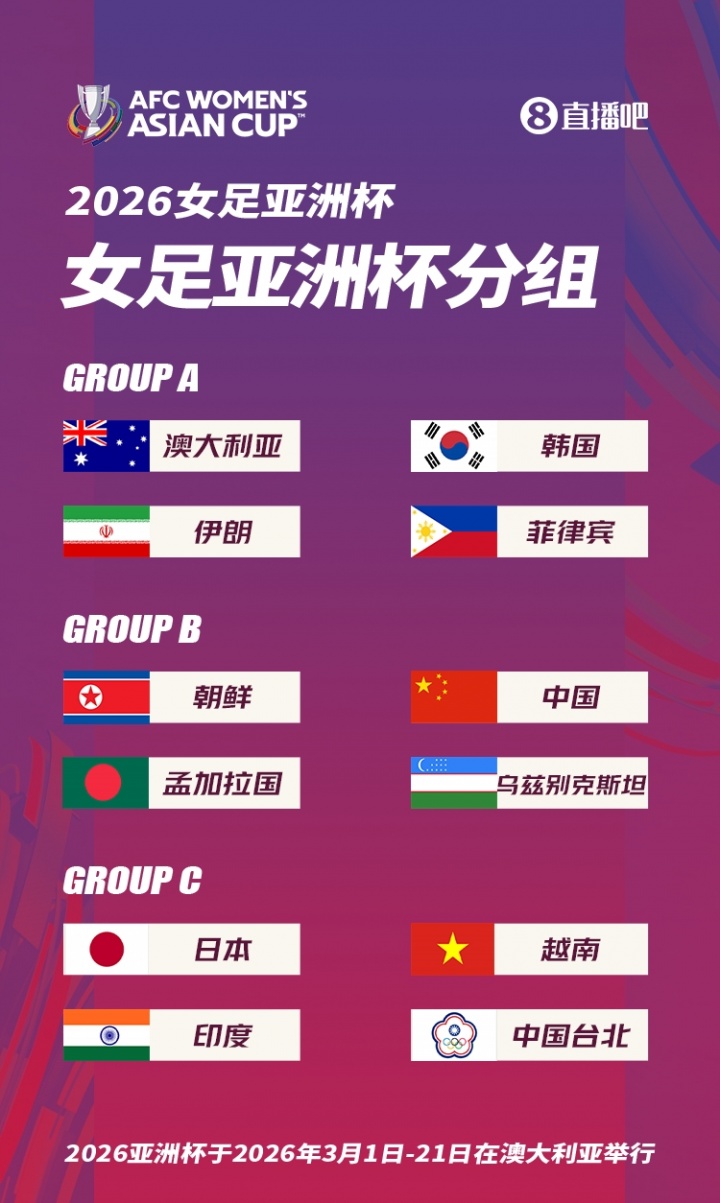 07月29日讯 北京时间今天17点,2026女足亚洲杯抽签仪式在悉尼举行,抽签结果已出炉,中国女足被分到B组,与朝鲜女足、孟加拉国女足、乌兹别克斯坦女足同组。