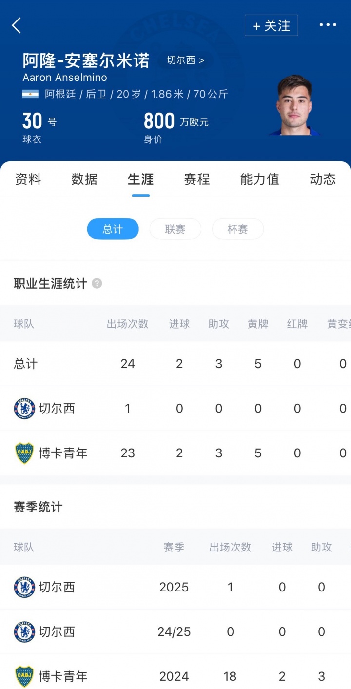 20岁的安塞尔米诺是切尔西去年夏窗从博卡青年签下的球员,他在今夏随切尔西获得世俱杯,仅代表切尔西出场过1次。
