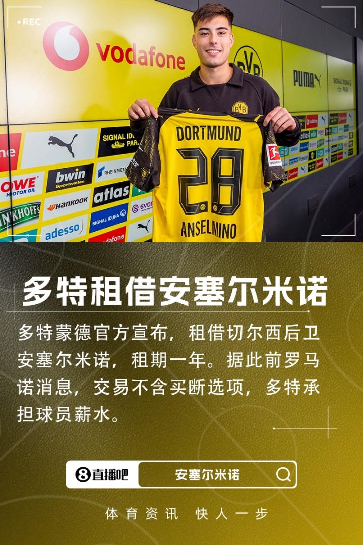 08月27日讯 官方消息,20岁切尔西后卫安塞尔米诺租借多特一个赛季,无买断选项。