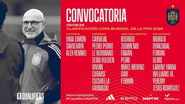 08月29日讯 西班牙国家队公布了新一期球员名单,亚马尔领衔,复出的卡瓦哈尔、罗德里回归,莫拉塔、赫伊森、苏维门迪等球员入选。西班牙国家队将征战9月份进行的世预赛欧洲区比赛。