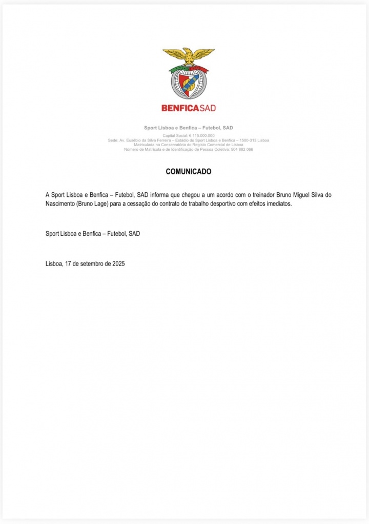 本菲卡足球俱乐部宣布已与主教练布鲁诺-拉热达成协议,解雇立即生效。